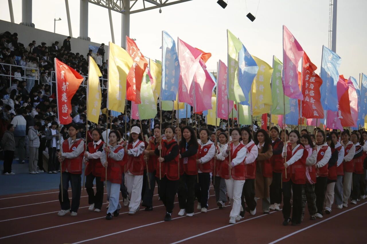 彩旗猎猎,翻飞如练。彩旗方阵手持缤纷旗帜,迈着轻快步伐,五彩旗帜在风中猎猎作响,为赛场铺开一幅绚丽画卷。