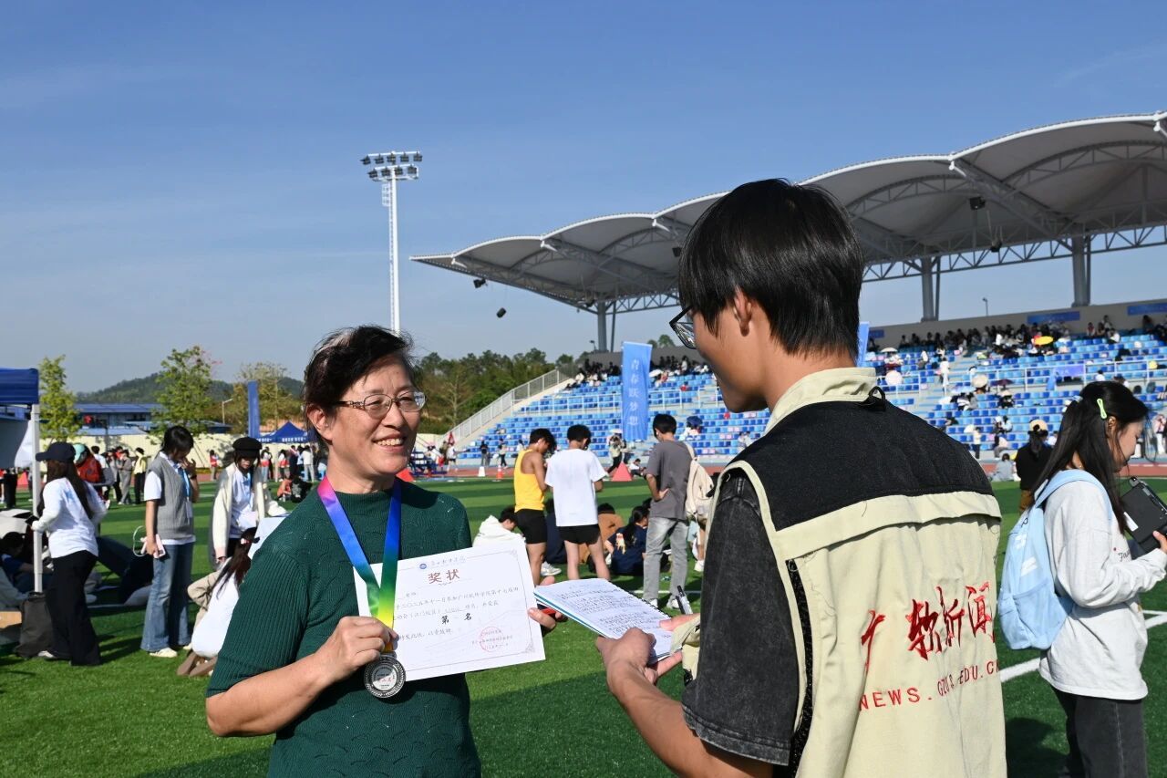 软件与人工智能学院的李雪梅老师在本次运动会教职工女子铅球比赛中取得了第二名的成绩。“高兴,十分高兴!”李雪梅老师笑着回答了关于赛后心情的提问。