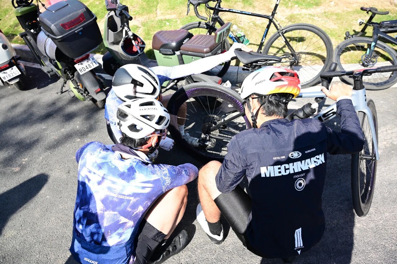 从广州软件学院广州校区出发,要骑行近100公里才能到达与江门的交接点——江顺大桥。一路上,骑行队员互相鼓励,不断调整,尽快适应公路骑行复杂的场景与不断的困难。“补胎”是这一次旅程上的“考点”,但对于准备充分的团队来说,并不是难事,他们利用随队的维修工具,快速处理后便可以继续出发。