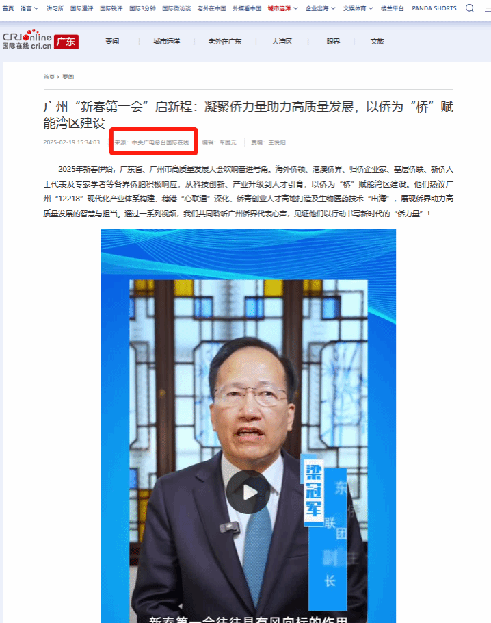 (【中央广电总台国际在线】广州软件学院董事长梁冠军:广州“新春第一会”启新程:凝聚侨力量助力高质量发展,以侨为“桥”赋能湾区建设(2025年2月19日)
