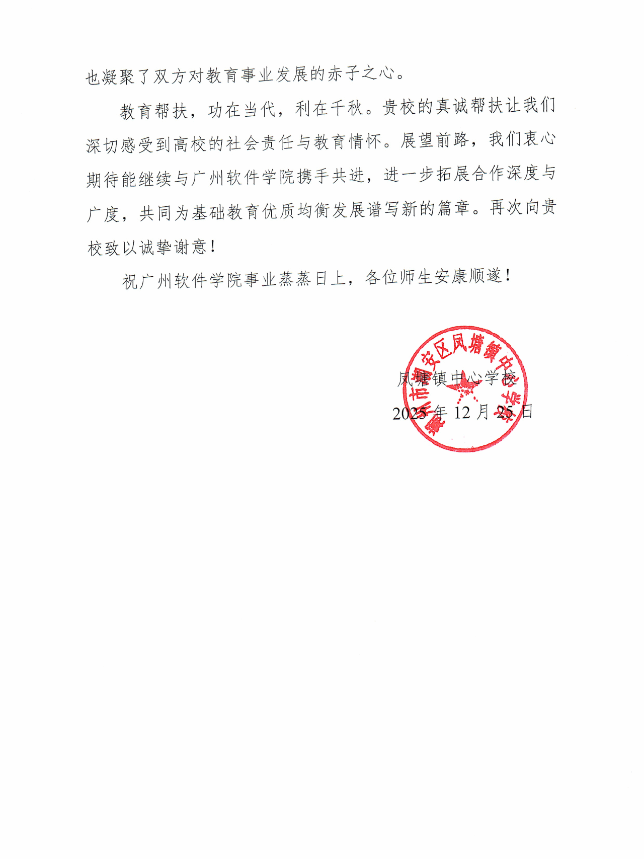 2025年12月25日至26日,学校党委副书记张广金,学校团委、外国语学院等部门负责人,潮州市基础教育帮扶工作小组等教师代表前往潮州开展2025年基础教育帮扶走访调研。12月26日,在潮安区东龙学校举行广州软件学院2025年潮州市基础教育帮扶总结会暨捐赠仪式。凤塘镇中心学校校长陈国礼、东龙小学校长邱文盛、淇园学校校长苏奕忠、义桥小学校长陈小华、凤塘镇中心学校苏贵忠老师出席仪式。