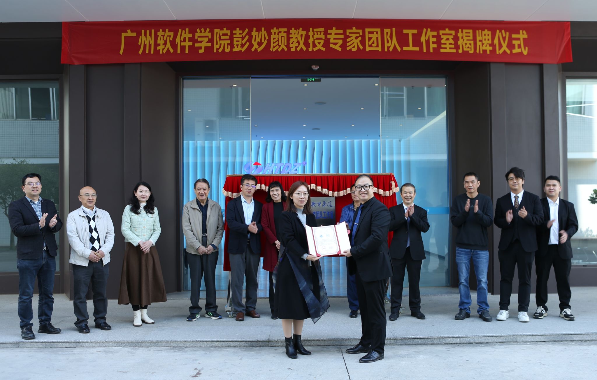 本网讯 2025年12月30日,广州软件学院与恩平市海天电子科技有限公司(以下简称“海天电子”)携手共建的“彭妙颜教授专家团队工作室”在江门正式揭牌。作为我校首个建立在国家级科技企业的专家团队工作室,该平台是学校深化产教融合、促进科技成果转化、赋能产业升级的重要举措,标志着我校在声光影视学科领域的校企合作与人才培养工作迈入新的发展阶段。