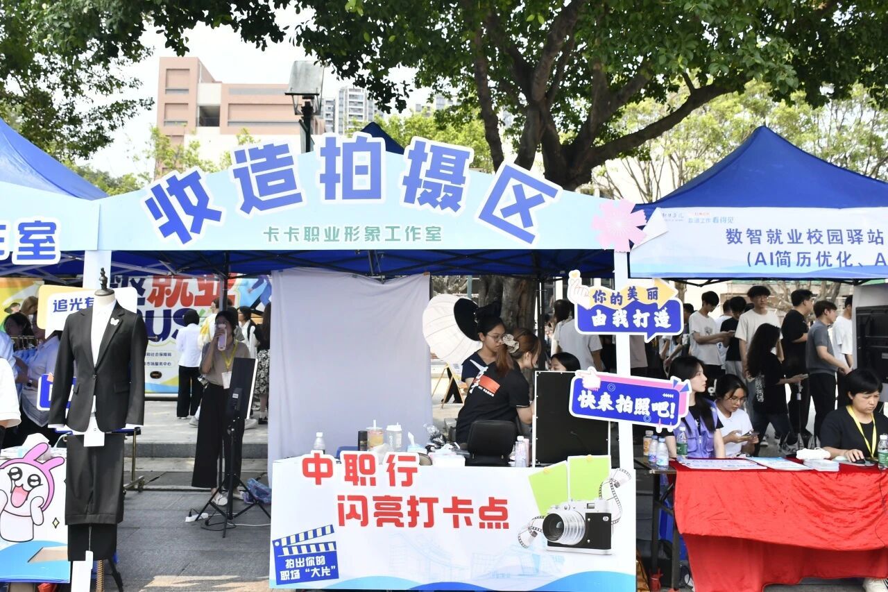 双选会现场,多家优质校友企业带着回馈母校,助力毕业生职业发展的诚意回校觅才。如学校优秀校友企业“中职行服饰”,以提供就业岗位等实际行动支持师弟师妹的职业发展,并在现场设置卡卡职业形象工作室专区,提供免费淡妆妆造、免费证件照拍照修图,职场形象一站式服务,带来了一场企业发展与求职就业的“双向奔赴”。