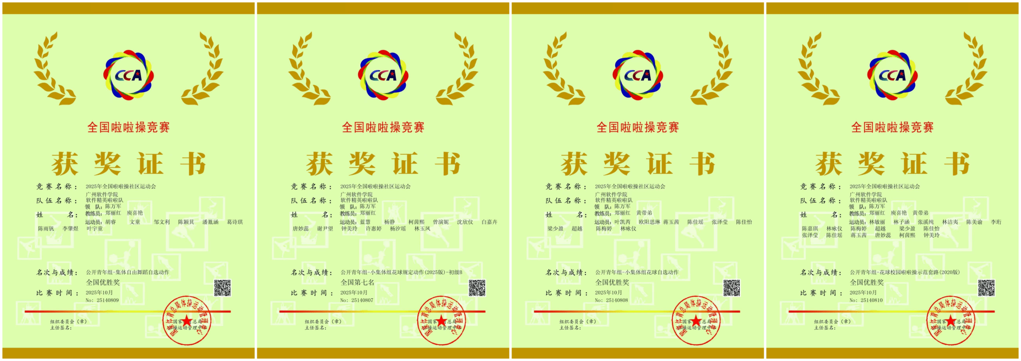 经过激烈角逐,我校代表队最终在四个项目中斩获佳绩,分别是公开青年组《小集体组花球规定动作(2025版)初级B》获得全国第7名、公开青年组《花球校园啦啦操规定示范套路(2020版)》获得全国优胜奖、公开青年组《小集体组花球自选动作)》获得全国优胜奖、公开青年组《集体自由舞蹈自选动作》获得全国优胜奖。