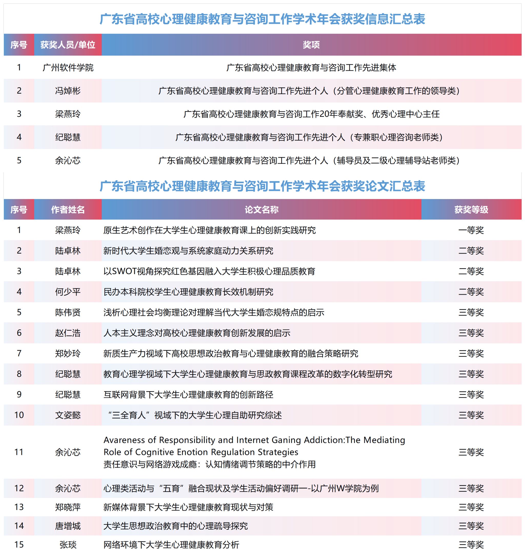 本网讯 近日,广东省高校心理健康教育与咨询工作学术年会在中山顺利召开。我校共有1个集体、5名个人、15篇心理健康教育相关研究论文,在学术年会上获得表彰。祝贺获奖教师及团队一起为他们点赞!