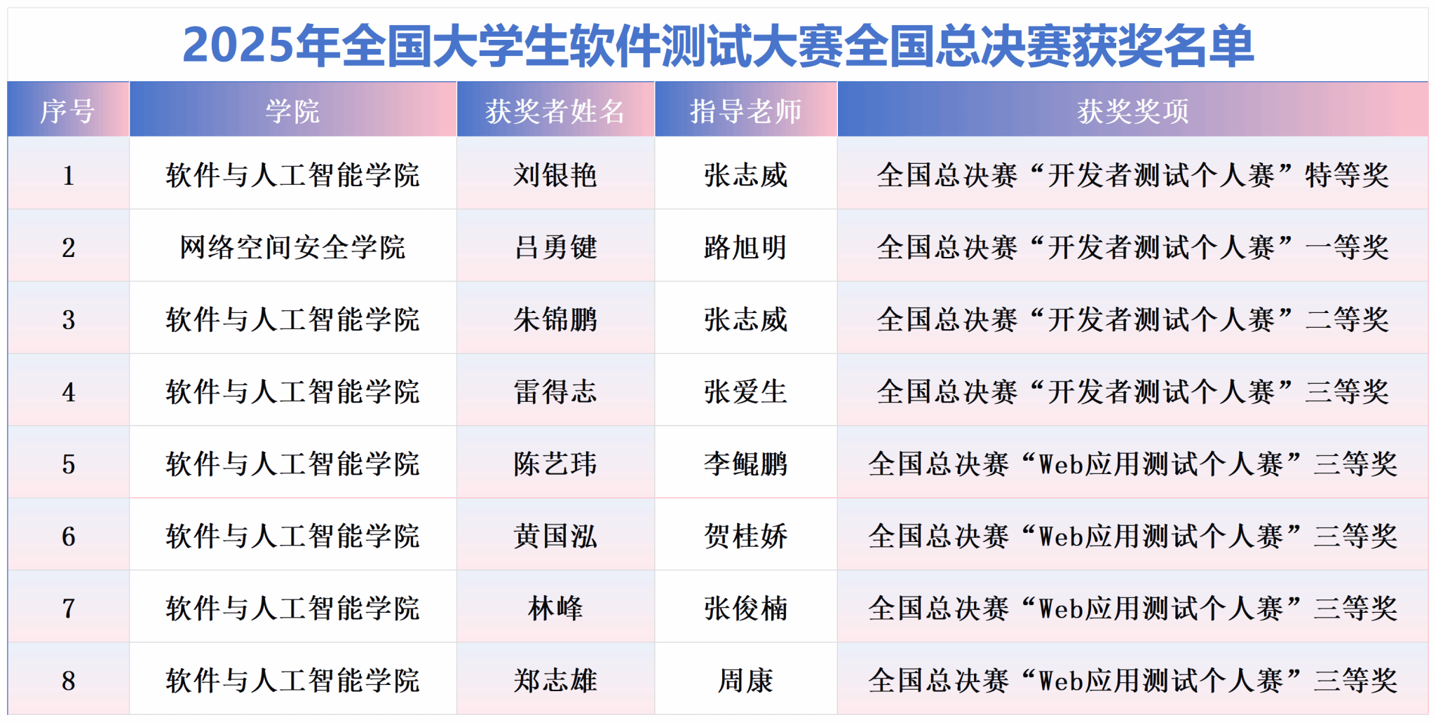 大赛指导老师、软件与人工智能学院软件测试与质量保证教研室主任张志威老师高兴地说:“从备战到决赛,同学们都展现了极高的热情和坚韧的毅力。”指导老师团队的策略始终围绕“以实战为导向”,将课堂理论融入赛题解析,重点培养学生解决复杂工程问题的系统性思维。“看到同学们在全国舞台上自信发挥、脱颖而出,由衷感到自豪。”张志威表示,这份荣誉属于每一位奋力拼搏的同学,也属于整个教学支持团队。